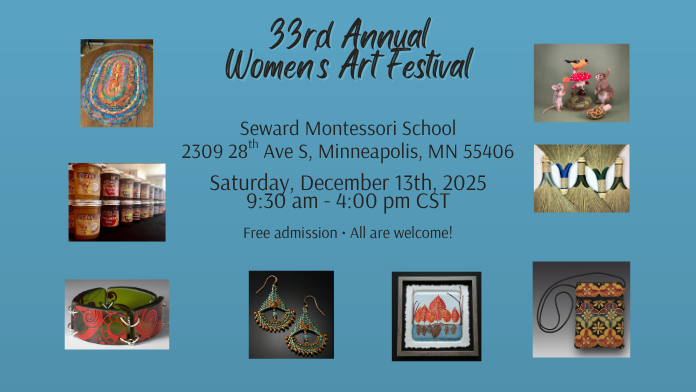 The 33rd Annual Women’s Art Festival will take place on Saturday, December 13, 2025, from 9:30 AM to 4 PM at a new location! This year’s festival will be held at the Seward Montessori School, 2309 28th Ave S, in Minneapolis and includes over 70 local women artists selling their artwork including jewelry, fiber, photography, painting, pottery and more. Admission is free and all are welcome. A $1 donation at the door is suggested to support the school PTA programs. There is plenty of free parking in the parking lot of the school and nearby streets.