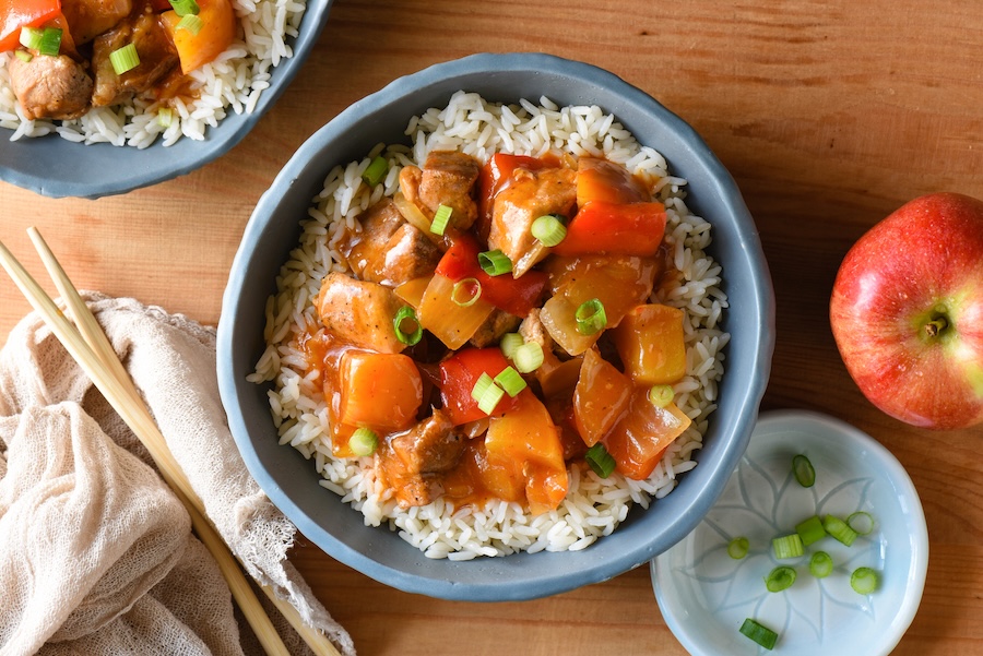 Here, another seasonal favorite, acorn squash, is paired with an apple and chicken sausage filling and baked into a comforting dish. Apples also star in a twist on sweet-and-sour pork dish served atop rice.