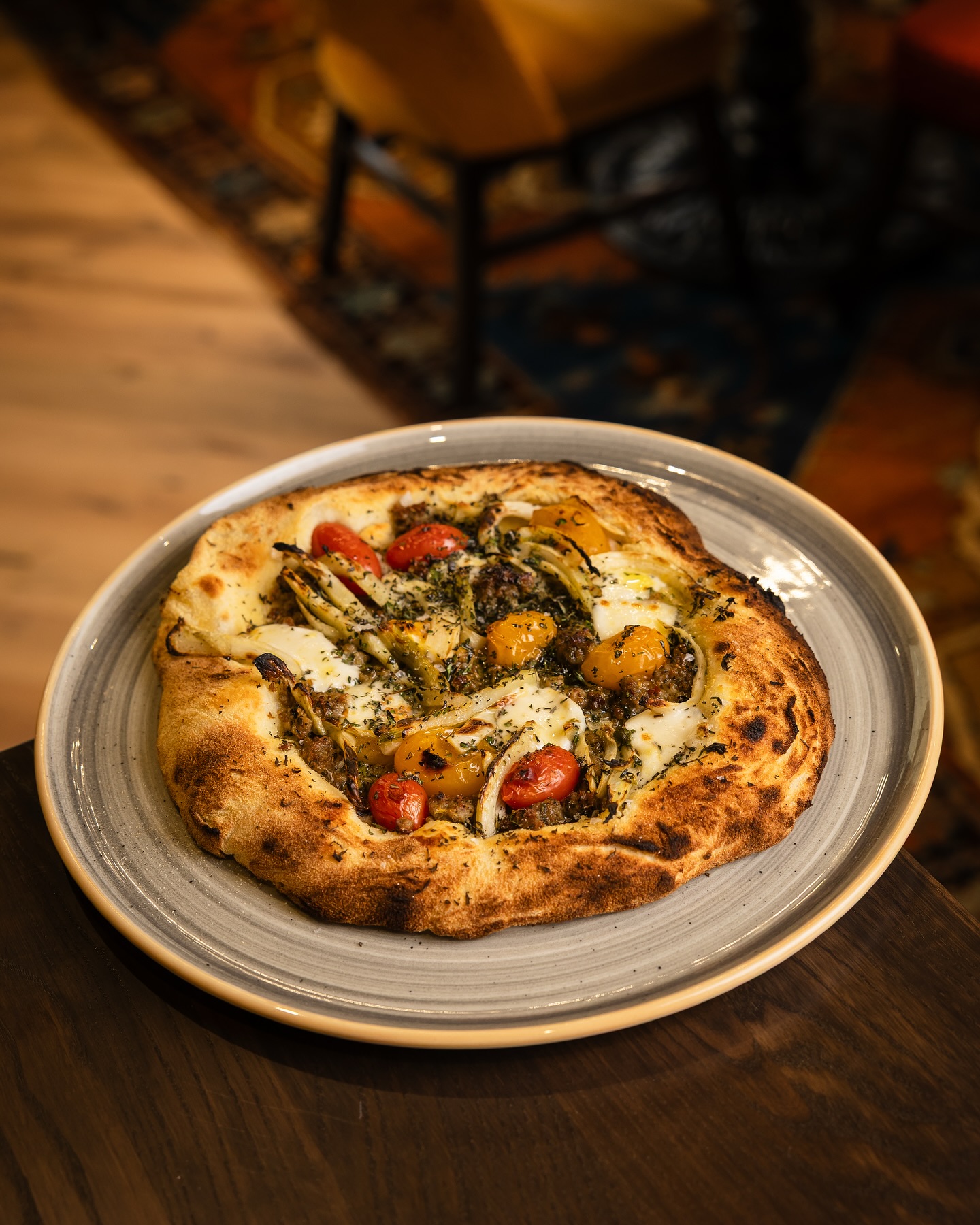 Do not miss the pizza: It’s one of the most unique doughs I’ve had in my life. Made with the famous sourdough starter that Fhima brought here from Morocco, which he believes is 100-plus years old. It’s somehow doughy and light. Cooked in a Neapolitan style (90 seconds at high heat), there’s a little flop in the middle, and it’s served the traditional way—uncut. The Four Cheese ($26) has mushrooms, artichokes, and Sicilian olives. Salty, cheesy, and so good, we ordered another one to take home with us. Start with a Sicilian version of a caprese salad, made with burrata and datterini tomatoes ($22). Vagabondo’s Panzanella Salad ($18) is also delightful with tomato, cucumber, and onions, along with little chunks of ciabatta toast. We loved the creamy Pappardelle Pancetta Carbonara ($32). This isn’t the Olive Garden version of carbonara—“We finish it in the sauce. The pasta spends 90 seconds in the water, so it retains the starch,” Fhima says. “Cream, butter, pecorino, Parmesan, and the pasta sucks all that flavor in.” It’s big-flavor pasta. Seafood Risotto ($49 full/$29 small) featured big shrimp, crab meat, and mussels on top of a buttery, creamy, French-style risotto. They offer full and small sizes (or as Vagabondo calls it, “nico”) of many of their pastas and risottos. Make it a casual hang with a pizza and glass of wine or a fancy night out with a T-bone steak or Sicilian baked fish.
