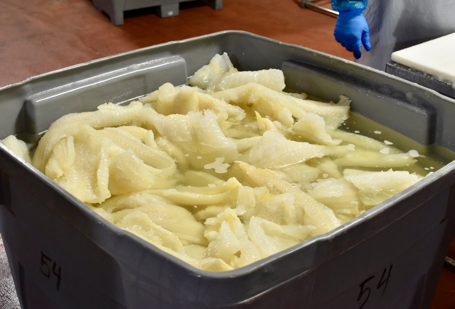 “We use lingcod [sourced from Norway],” says Chris Dorff, president of Olsen. “And it’s all caught on what they call a longline—so, a line will go out with, like, 10,000 hooks on it, and every hook’s baited. It’s all certified sustainable. But I’ll tell you what: that container, if there’s 40,000 pounds of dried fish in there, and it’s sealed up for like five weeks, and you open the doors when it gets here, it’s pretty strong.”